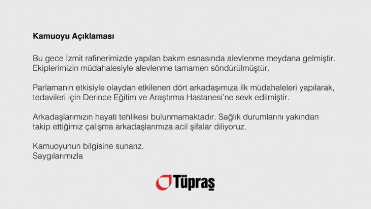 Kocaeli’de 4 işçinin yaralandığı olay sonrası Tüpraş’tan açıklama geldi.