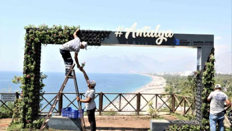 Antalya Büyükşehir Belediyesi'nin Konyaaltı sahilini kuşbakışı gören Varyant Seyir Terası'na yaptırdığı ve aşırı sıcaklara dayanamayarak çiçekleri kuruyan simge çerçeve yeniden yeşillendirildi.