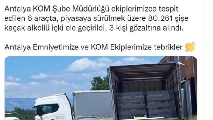 “Kaçak içkiye büyük darbe! Antalya KOM Şube Müdürlüğü ekiplerimizce tespit edilen 6 araçta, piyasaya sürülmek üzere 80.261 şişe kaçak alkollü içki ele geçirildi, 3 kişi gözaltına alındı. Antalya Emniyetimize ve KOM Ekiplerimize tebrikler”