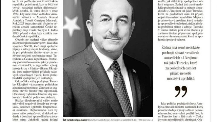 Çekya’nın ünlü gazetesi Lidove Noviny, resmi ziyaret için ülkede bulunan Dışişleri Bakanı Mevlüt Çavuşoğlu’nun “Türkiye’nin Çekya’yı tanımasının 30. yıldönümünde Türk-Çek ilişkilerine genel bakış” başlıklı makalesini yayınladı. Makalesinde zengin tarihi ve kültürü ile Çekya’nın, Türkiye’nin Orta Avrupa ile bağlarında özel bir yere sahip olduğunu belirten Çavuşoğlu, iki vizyoner devlet adamı Mustafa Kemal Atatürk ve Tomas Garrigue Masaryk önderliğinde 1924’de kurulan diplomatik ilişkilerin yüzüncü yılına yaklaştığı dönemde gerçekleştirdiği ziyaretin önemine dikkat çekti. Çavuşoğlu, Türkiye’nin 2023’te Çek Cumhuriyeti’ni tanımasının 30. yıl dönümü olacağını hatırlattı. Covid-19 salgını gibi küresel ölçekteki sorunların, Suriye’deki kriz ve Ukrayna’daki savaş gibi bölgesel gelişmelerin, ortak çıkarları ve değerleri olan iki NATO müttefikinin daha fazla işbirliğine ihtiyaç duyduğunu ortaya koyan son gelişmeler olduğunu yazdı.
