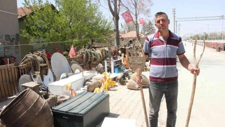 Karaman'ın Kazımkarabekir ilçesinde hurdacılık işiyle uğraşan Halit Ordu, çöplerden ve satın alarak topladığı eski tarım aletlerini kiraladığı evin önünde ve bahçesinde sergiliyor.