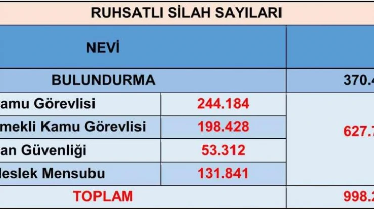 Bazı internet sitelerinde “Bireysel silahlanmanın arttığı ve Türkiye’de 25 milyon ruhsatsız, 2,5 milyon ruhsatlı silah olduğu” yönünde yapılan haberlere ilişkin Emniyet Genel Müdürlüğü’nden açıklama yapıldı. Ülkelerin toplam nüfuslarına göre ruhsatlı silah oranlarının İtalya’da yüzde 11,5, Çek Cumhuriyeti’nde yüzde 8,3, Almanya’da yüzde 6,6, İspanya’da yüzde 6,3, Fransa’da yüzde 4,8 ve Türkiye’de yüzde 3 olduğu belirtildi. Son beş yılın rakamlarına bakıldığında yeni verilen ruhsatlı silah sayısında azalma olduğunun görüldüğünün altı çizilen açıklamada, “Ülkemiz genelinde kamu görevlisi 244 bin 184, emekli kamu görevlisi 198 bin 428, can güvenliği 53 bin 312, meslek mensubu 131 bin 841 olmak üzere toplam 627 bin 765 taşıma ruhsatlı silah bulunmaktadır. Kendi kanunlarına göre silah taşımaya haiz bu kamu görevlilerinin birden fazla silah edinebilme ve bu silahları yıl içerisinde kendi aralarında devir etme hakları bulunmaktadır. Taşıma ruhsatlı silahların 185 bin 153 adedini ise can güvenliği ve meslek mensubiyeti olan birden fazla edinim hakkı bulunan sivil vatandaşlar oluşturmaktadır. Yıl içerisinde düzenlenen silah taşıma ruhsat sayıları aktif silah bulunan kişi sayısını değil, düzenlenen ruhsat sayısını ifade etmektedir. Emniyet ve jandarma sorumluluk bölgelerinde son 5 yıllık döneme bakıldığında ateşli silah ve kesici delici aletle işlenen toplam olay sayısı ve bu olaylarda hayatını kaybeden kişi sayısında düşüş meydana geldiği görülmektedir” denildi.