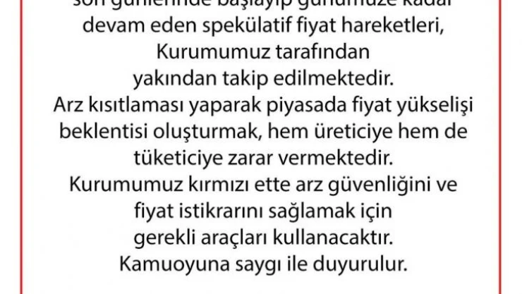 Et ve Süt Kurumu’nun sosyal medya hesabından yapılan paylaşımda, “Et fiyatları üzerinde Ramazan ayının son günlerinde başlayıp günümüze kadar devam eden spekülatif fiyat hareketleri kurumumuz tarafından yakından takip edilmektedir. Arz kısıtlaması yaparak piyasada fiyat yükselişi beklentisini oluşturmak, hem üreticiye hem de tüketiciye zarar vermektedir. Kurumumuz kırmızı ette arz güvenliğini ve fiyat istikrarını sağlamak için gerekli araçları kullanacaktır” ifadelerine yer verildi.
