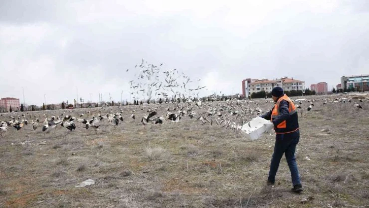 Konya’da olumsuz hava şartları sebebiyle zorunlu olarak araziye inen leylekler, Konya Büyükşehir Belediyesi tarafından balıkla besleniyor.