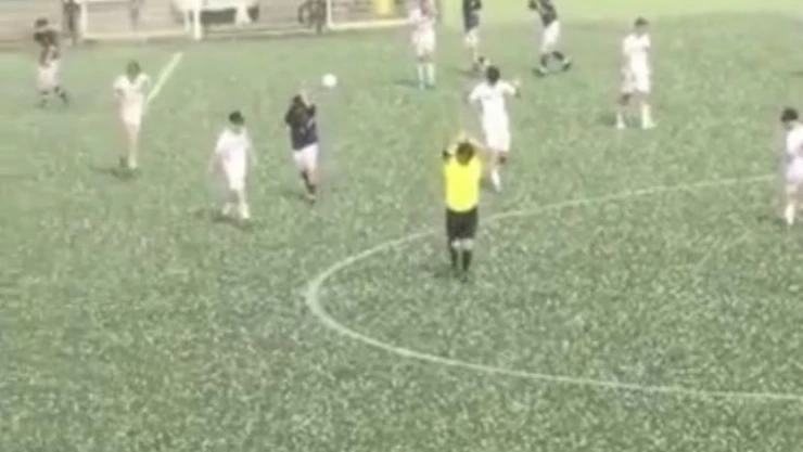 Amatör lig maçına dolu yağışı nedeniyle bir süre ara verilirken dolunun durmasıyla birlikte maç devam etti.