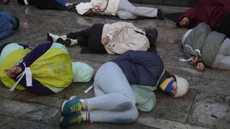 Gürcistan'ın başkenti Tiflis'teki parlamento binası önünde, Ukrayna'nın Bucha ve diğer şehirlerindeki Rusya saldırısı protesto edildi. Göstericiler, elleri arkadan bağlı şekilde parlamento binasının önünde yere yattı.