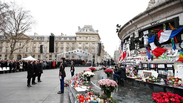 Fransa'nın başkenti Paris'te Cumhuriyet Meydanı'ndaki törene Fransa Cumhurbaşkanı François Hollande, Başbakan Manuel Valls, Paris Belediye Başkanı Anne Hidalgo, Dışişleri Bakanı Laurent Fabius, Senato Başkanı Gerard Larcher ve bakanların yanı sıra milletvekilleri ve saldırılarda ölenlerin yakınları katıldı.
