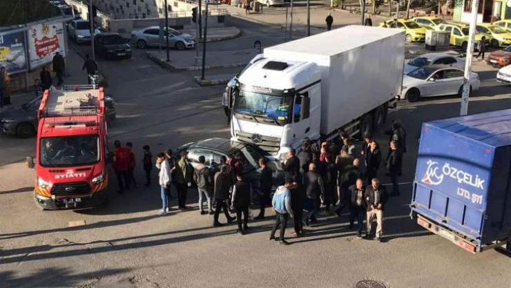 Ağrı'da yoğun trafiğin olduğu kavşakta kendi şeridini takip etmeyen otomobil sürücüsü önüne çıkan kamyona çarptı.