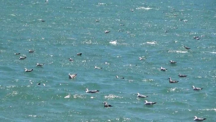 Tekirdağ’ın Süleymanpaşa ilçesinde denizde oluşan dalgalar nedeniyle uluslararası ticaret gemileri açıkta demirleyerek beklerken, poyraz nedeniyle uçamayan yüzlerce martı, denize konarak rüzgârın azalmasını bekledi.