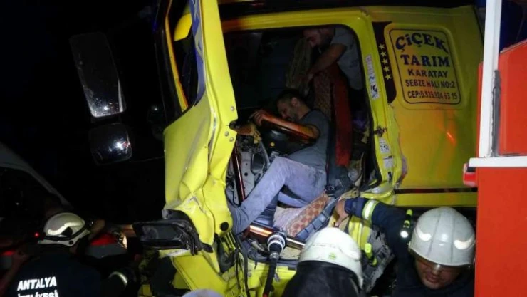 Antalya'nın Manavgat ilçesinde kamyonun tıra arkadan çarpması sonucu meydana gelen kazada aracında sıkışan kamyon sürücüsü, 1 saatlik çalışma sonunda çıkarılarak hastaneye kaldırıldı. Sürücünün durumunun iyi olduğu, taburcu edildiği bildirildi.