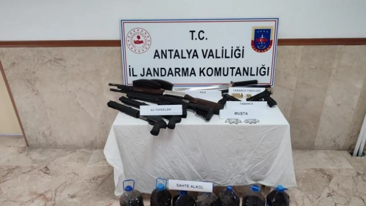 Antalya'nın Manavgat ilçesinde İlçe J.K.lığı ekipleri, turizm bölgesinde umuma açık işletmelerde denetim yaptı. 5 işletmede yapılan aramalarda 2 adet ruhsatsız tabanca, 4 adet ruhsatsız tüfek, 75 adet tabanca fişeği, 1 adet samuray kılıcı, 2 adet muşta, 35 litre sahte/kaçak içki, 1 şişe yurtdışı kaçak alkol ele geçirildi. Ayrıca kapalı alanda sigara içildiği tespit edildi. Kontrollerde işletmede çalıştıkları tespit edilen ülkeye yasadışı yollardan giriş yapan 2 yabancı uyruklu şahıs da yakalandı. İşletmeler ve şahıslar hakkında adli ve idari işlemlere başlatıldı.