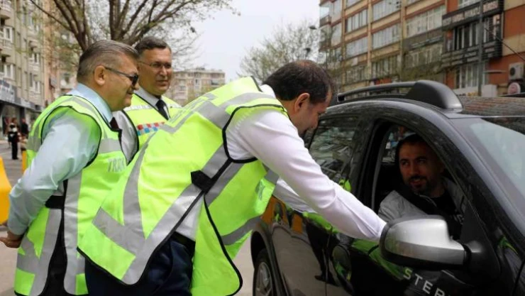 Vali Salih Ayhan sürücülere bayram şekeri ve kuralları hatırlatan broşür de takdim etti.